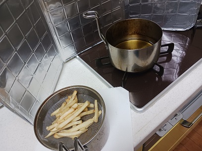 夜、ポテトを揚げる